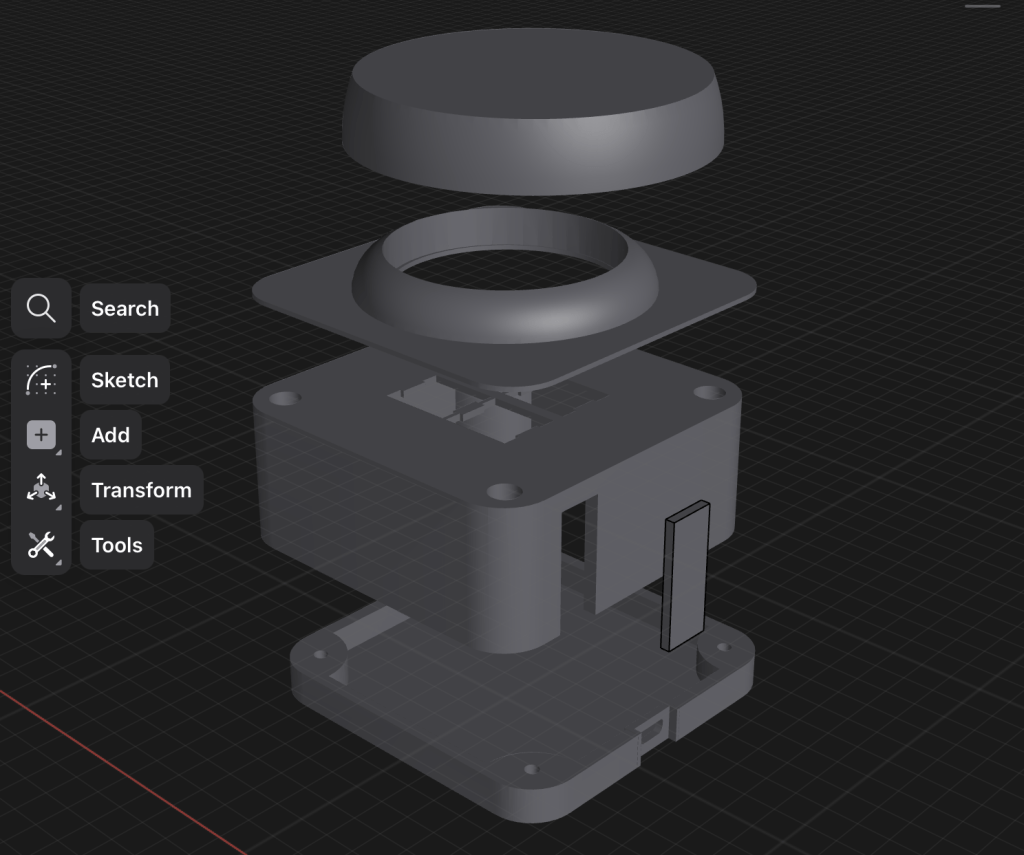 Ściąłem dolną część (za wysoka), dodałem miejsce na port micro USB, do tego ozdobne wcięcie na element z innego niż bazowy filamentu a także dwie ozdobne płytki do przyklejenia na przycisk i poniżej. Sam przycisk, który jest półokrągły, ściąłem u szczytu. Jako program CAD użyłem Shapr3D.