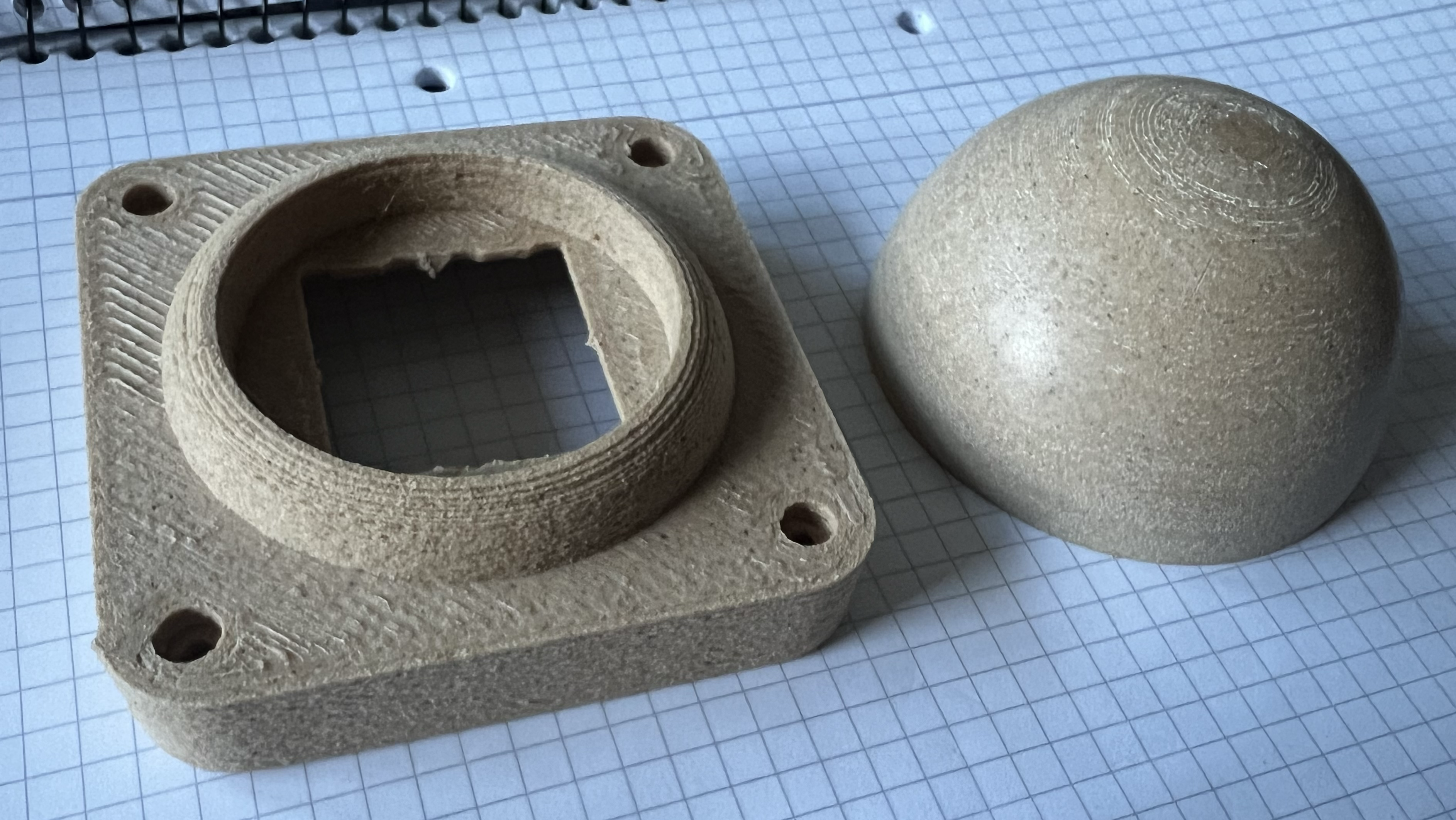 Była to okazja do przetestowania nowego drewnianego filamentu. W praktyce okazał się on zbyt kruchy, wymagał zmiany dyszy na większą (0.5 mm to absolutne minimum, aby się nie zapychała), a estetycznie zostawiał wiele do życzenia, nawet po starannym piaskowaniu (efekt po prawej).